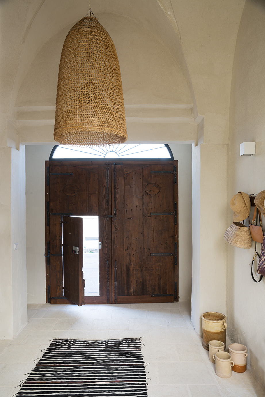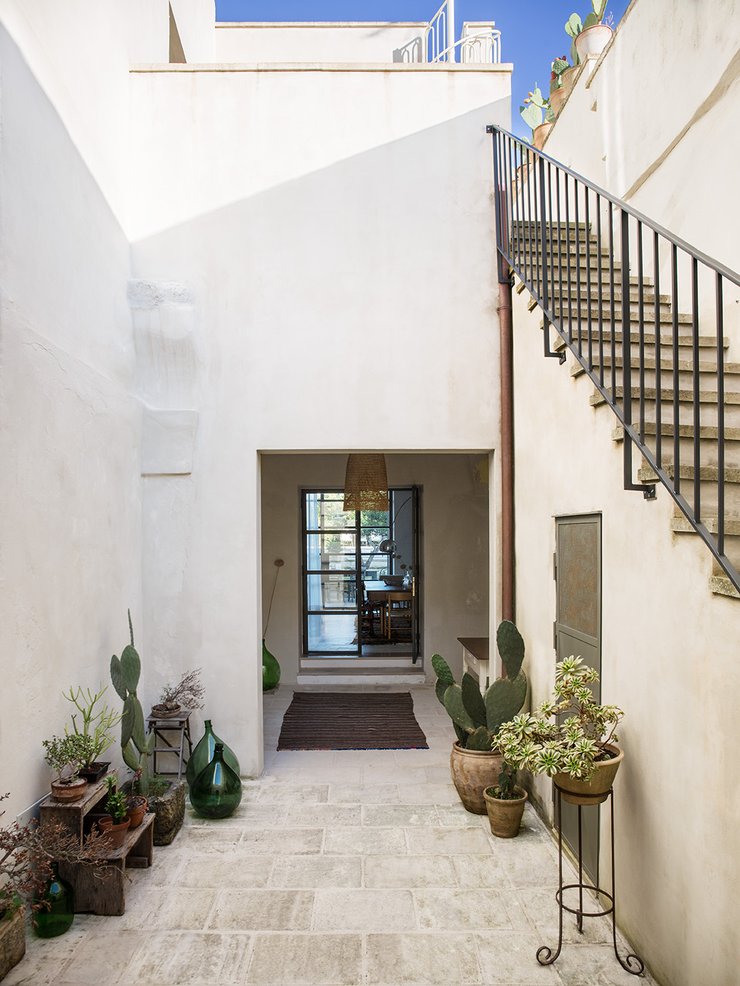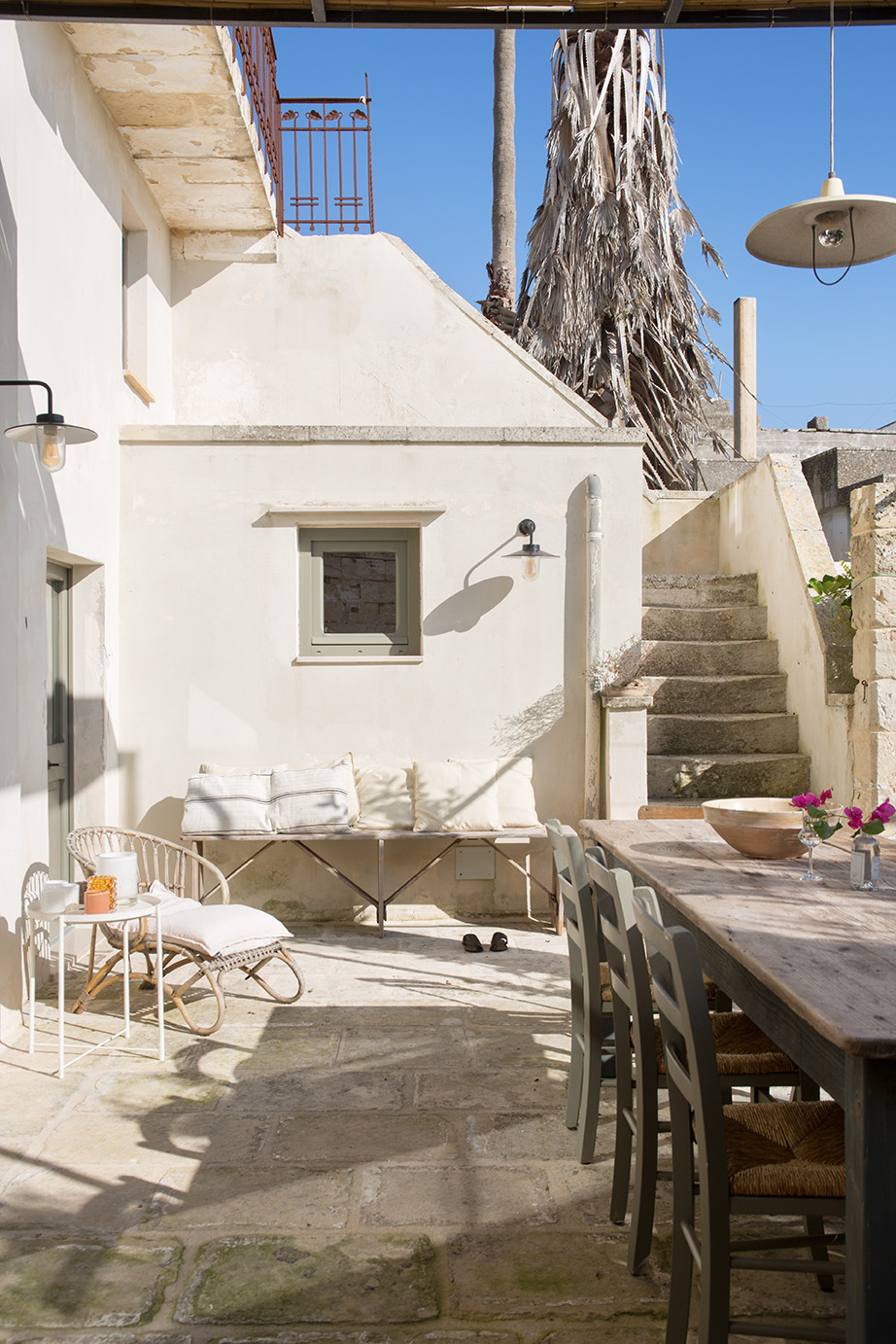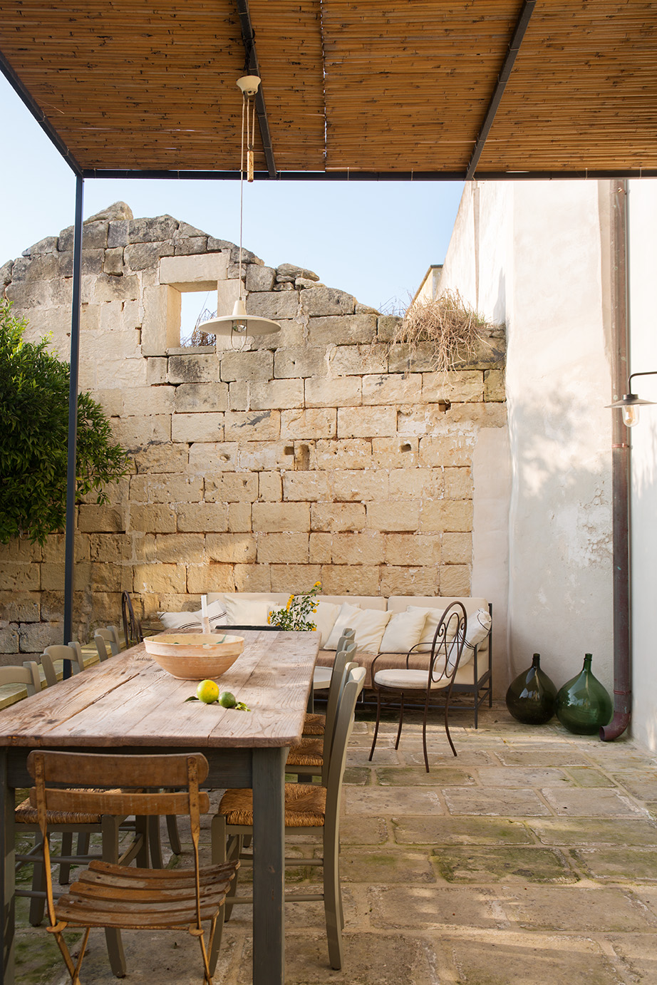 - Pavimentazioni: Il progetto ha previsto il recupero delle cementine esistenti, insieme a nuove pavimentazioni in basole di pietra leccese e battuto di cemento, creando un ambiente elegante e accogliente.