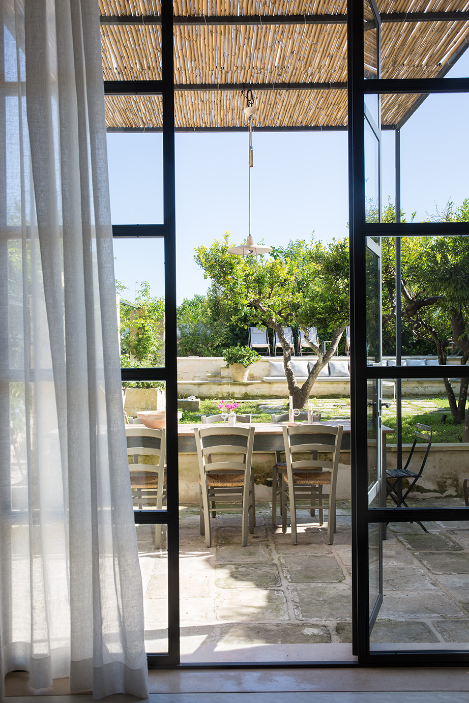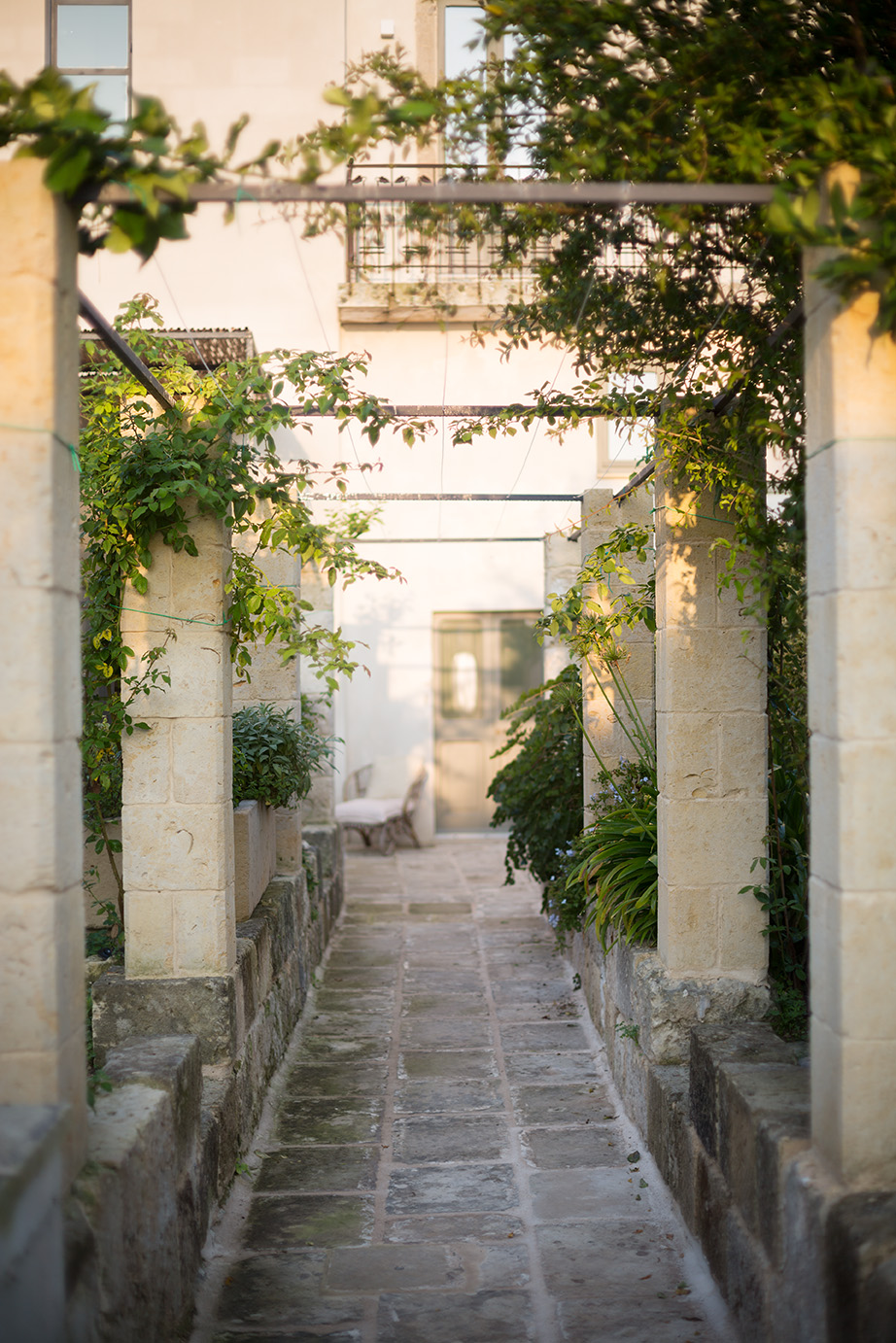 - Ricostruzione del pergolato: È stato ricostruito un percorso pergolato con colonne in pietra leccese, creando un collegamento armonico tra gli spazi esterni e interni.