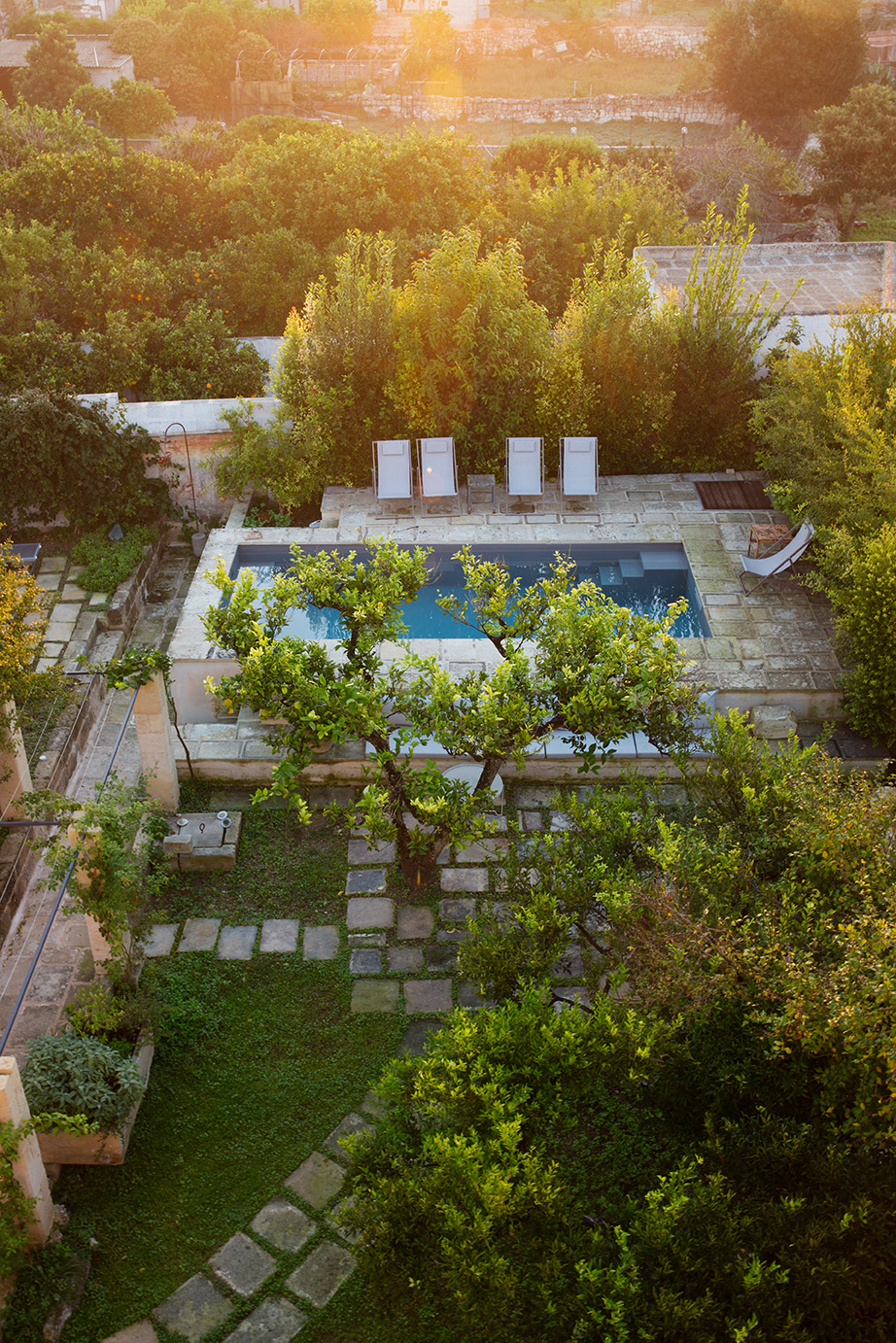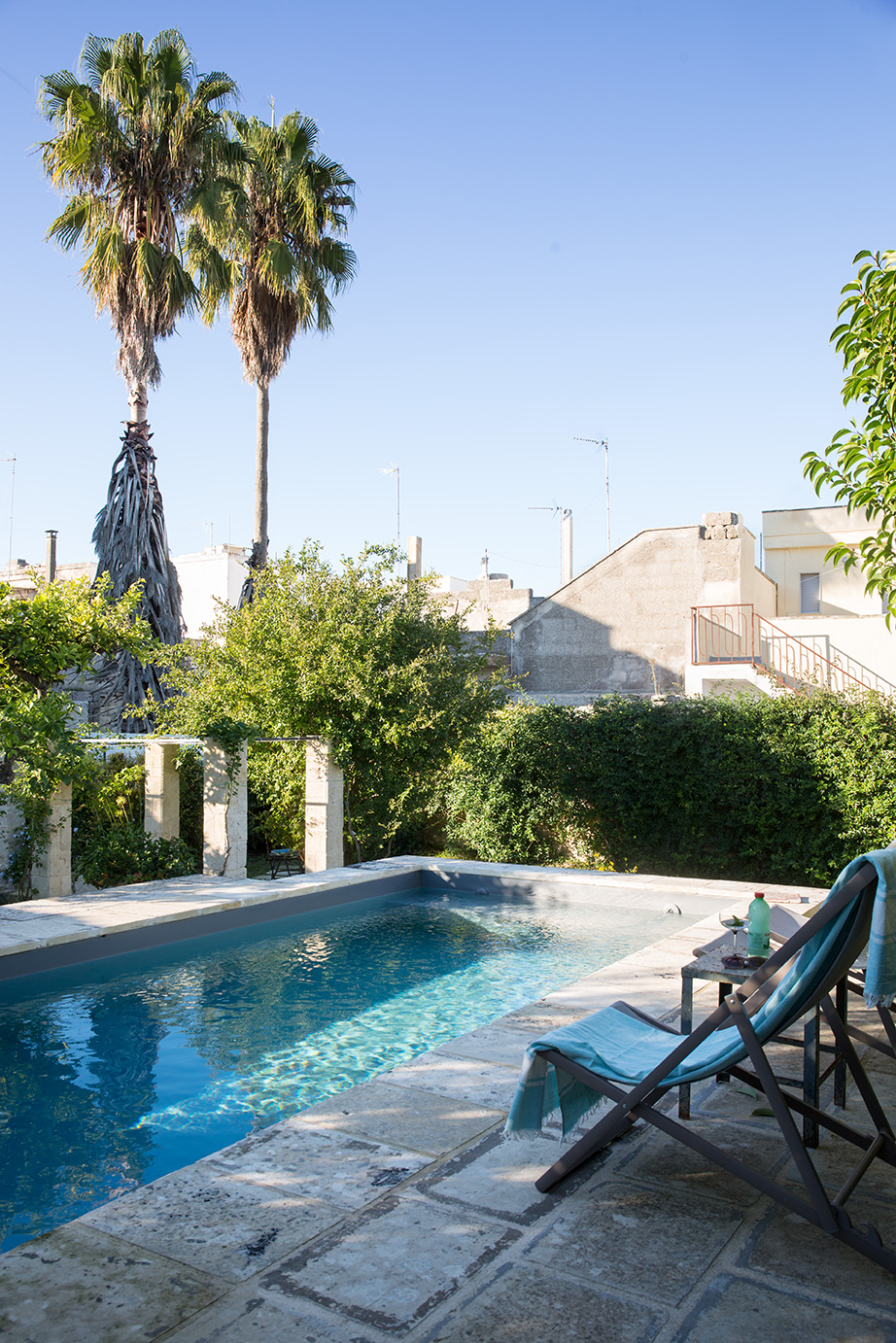 - Piscina e spazi esterni: La nuova piscina in cemento armato, con finitura esterna in chianche antiche, aggiunge un tocco di lusso e relax, mentre gli esterni pavimentati con basole antiche di pietra leccese completano l’atmosfera.